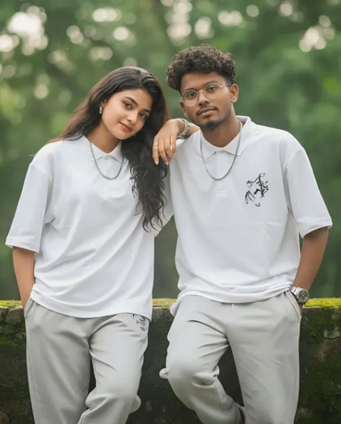 A 17 years bf gf learning a wall in outdoors (the girl beautiful) lighting standing and bf gf wars oversized white printed polo t-shirt and buggy grey jogger pant. stylish hair. uniq pose.soft light blured background. Background green tree blured filled bokeh .silver neek,glasses. watch.stylish pose., beautiful weather.make photo green trre blured filled bokeh.Keep both face only 100% same as in the reference image.