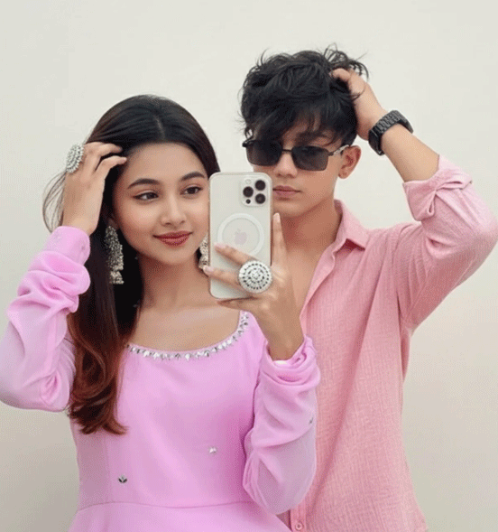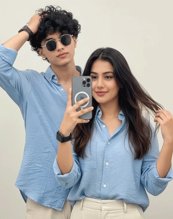Ultra -realistic a selfie young couples in front of a plain or softly-lit background. Hold your phone in one hand so it’s visible in the mirror, and use your other hand to run through your hair, showing your wristwatch or bracelet clearly. Wear a same dress, and make sure your face is partially covered by your hand and hair for a casually stylish look. (Add any 100% same face match in reference)