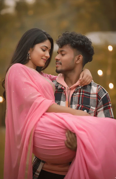 Cute Couple He lifts her carefully in his arms, her pink lehenga flowing naturally, dupatta slightly draped over his arm. Expressions: Her eyes half-closed in trust, a soft smile; he looks down at her with tenderness, lips slightly curved, jaw relaxed. DSLR Angle: Medium-close 85mm f/1.4 focus on both faces, fabric and hands lightly blurred. Mood: Warm candlelight or soft evening glow, gentle shadows highlighting care and intimacy.
