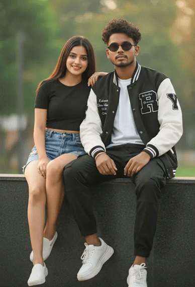 Ultra-realistic 8K cinematic full-body portrait of a stylish young man with a sitting against a modern dark wall outdoors. Use the uploaded photo exactly, keeping the original face and shape without any alteration-face must be glowing, Outfit: black cargo pants, chunky white sneakers, professional white T-shirt, bold black and white varsity jacket (size S). Accessories: black round sunglasses. Pose: sitting naturally on the wall. Next to him, a beautiful young Woman.