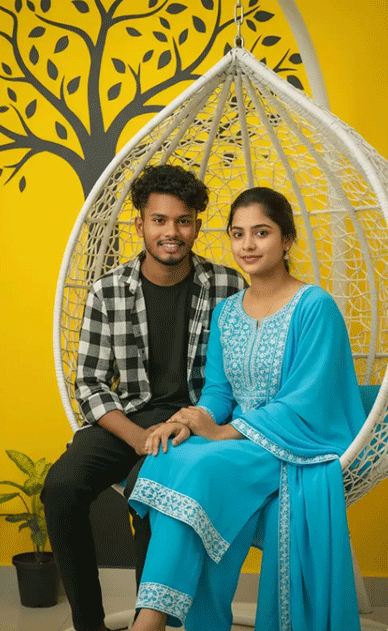 Create an Young couple Boy wearinga Black and white checkered Shirt Together Create a features a young woman sitting in a hanging,egg-shaped wicker chair indoors.She is dressed in a vibrant, all-sky-blue traditional South Asian outfit (likelya shalwar kameez or kurta setTheoutfit has white embroidery on the chest of the top kurtaand on the matching pant and large dupatta The background is livelyA brightyellow wall with a stylized black tree silhouette painted on it.