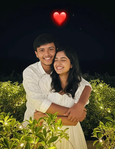 Create image of A cute 20 year old Indian young couple taking a night-time selfie outdoors. The boy is wearing a white and white check shirt and smiling while hugging the girl from behind. The girl is in a white puff-sleeve dress, eyes closed, smiling happily. They are standing near green plants with small lights, and a red heart emoji in glow is above them in the dark background. Bright and candid romantic moment, natural lighting with a flash.