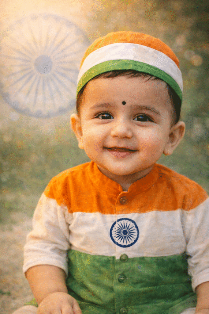 A cinematic Republic Day portrait of a smiling Indian baby boy with a tiny tricolor cap, Ashoka Chakra visible in the background, soft sunlight, emotional patriotic mood, shallow depth of field.