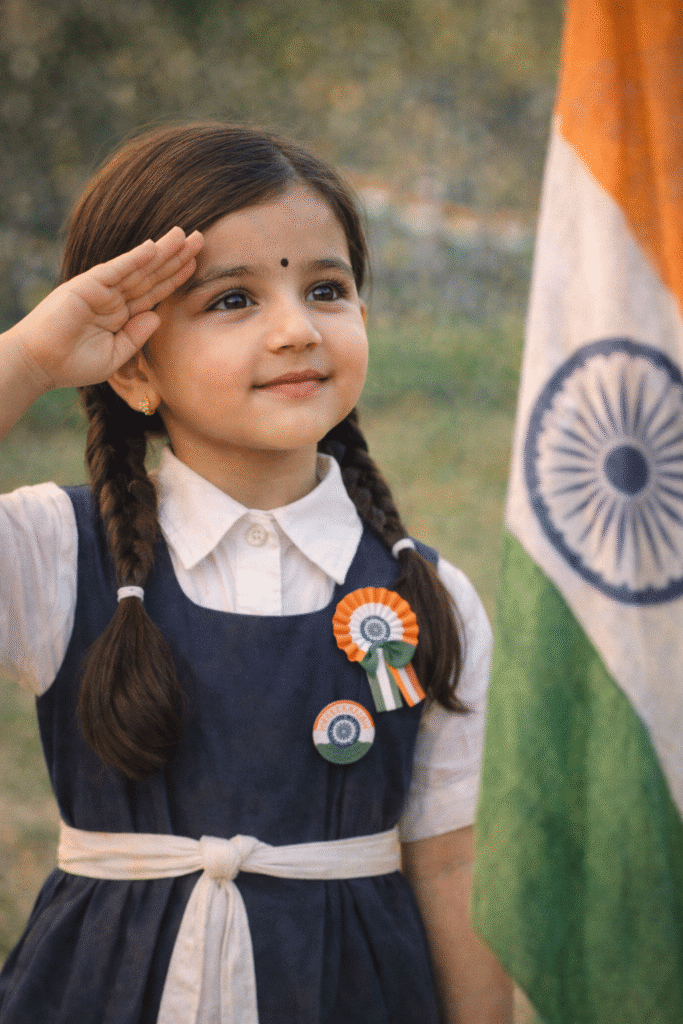 A cinematic photo of an Indian school girl saluting the Indian flag, tricolor badges on uniform, soft background blur, emotional patriotic tone, DSLR photography, high resolution.
