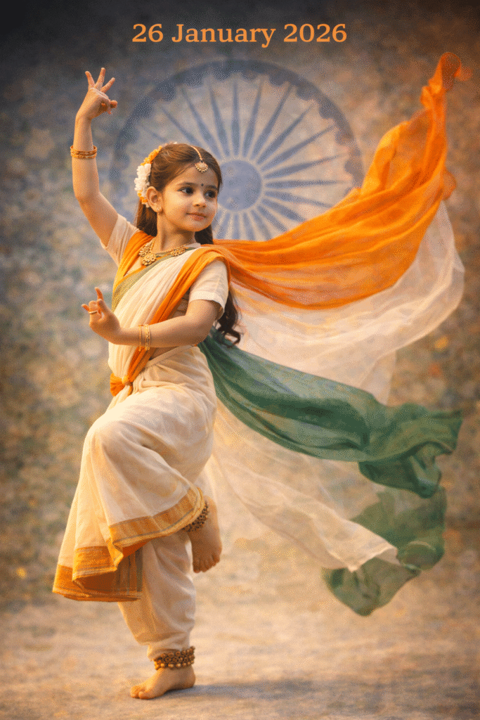 A creative Republic Day image of an Indian girl performing a classical dance pose, tricolor dupatta flowing, Ashoka Chakra in background, artistic lighting, cultural pride, 26 January 2026.
