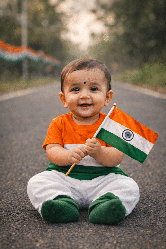 A high-quality, realistic photo of an Indian baby sitting on the road holding a small Indian national flag, wearing tricolor clothes, innocent smile, soft natural lighting, blurred background, Republic Day celebration mood.