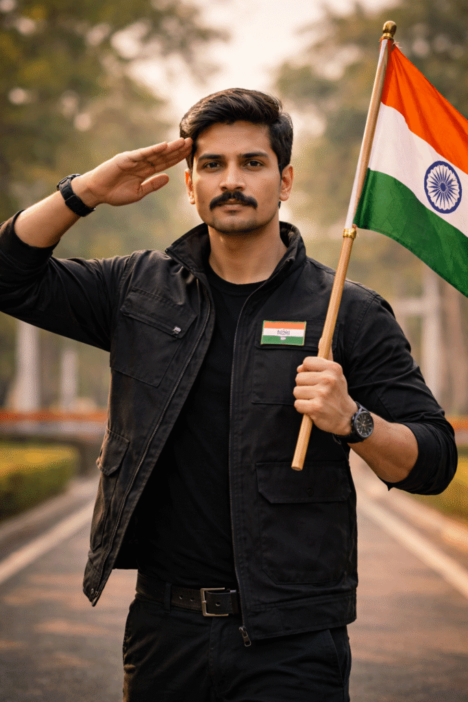 A realistic, ultra-sharp portrait of a young Indian man standing confidently outdoors, wearing a black jacket with a subtle “India” badge, giving a respectful military-style salute with his right hand. He is holding the Indian national flag (tricolor with Ashoka Chakra) on a wooden flagpole in his left hand. The background shows a softly blurred park or memorial-style structure with warm natural daylight. Serious yet proud facial expression, clean haircut, cinematic depth of field, DSLR photography style, natural skin tones, high contrast, patriotic mood, 4K resolution.