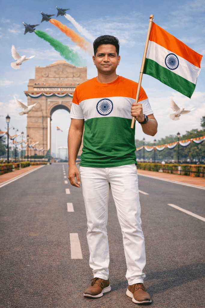 Use the uploaded selfie as an accurate facial reference. Create a highly realistic, cinematic Republic Day full-body image. Person standing confidently on a clean road in front of India Gate, New Delhi, looking at the camera. Wearing a tricolor t-shirt (saffron, white with Ashoka Chakra, green), bright white pants, stylish shoes, and a watch on the left wrist, holding the Indian national flag. Background: decorated India Gate, blue sky, white doves, Indian Air Force jets with tricolor smoke trails, slightly blurred. Vibrant patriotic mood, perfect lighting, natural shadows, sharp focus, realistic skin texture, no wide-angle lens, no blur or distortion, ultra-HD 4K, DSLR quality, Instagram-ready.