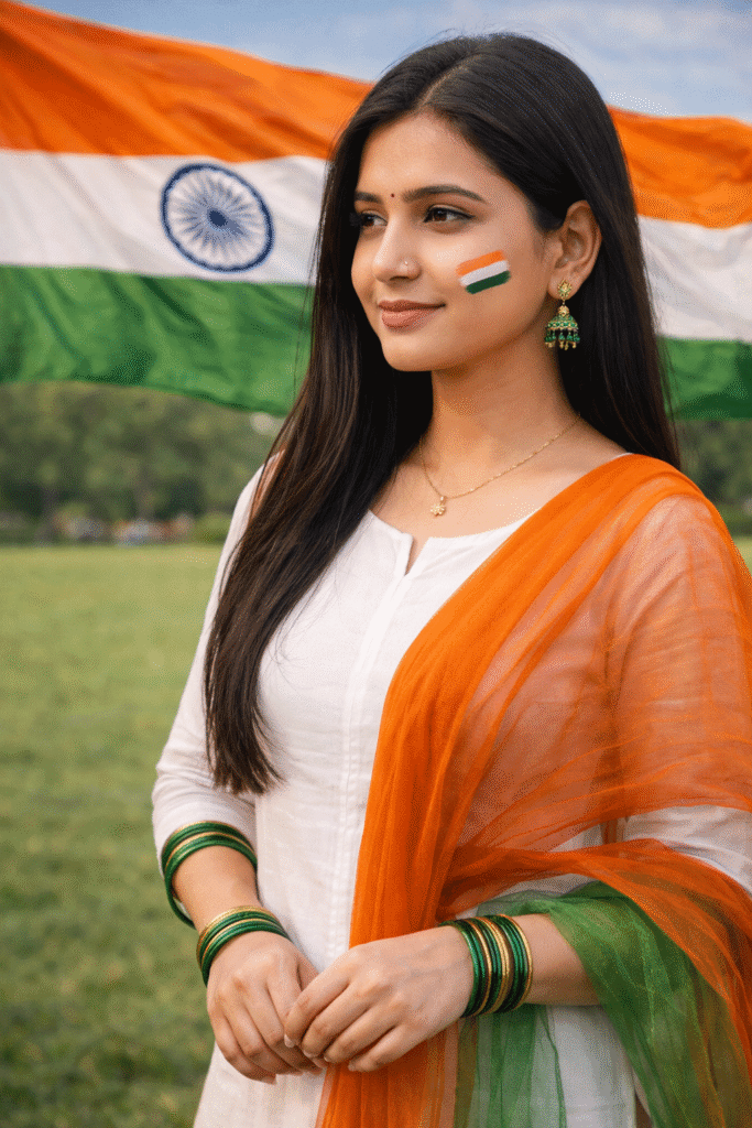 A beautiful Indian woman standing outdoors in front of a large Indian national flag (Tiranga) waving in the background. Additionally, she has long straight dark hair, natural makeup with subtle pink lipstick, and a small tricolor paint design on her cheek. She is wearing a plain white kurti with an orange transparent dupatta draped over one shoulder and green bangles on both hands. Moreover, she has a gold nose pin, delicate gold necklace, and traditional green jhumka earrings. Soft natural daylight, with a slight breeze making the dupatta and flag flow. Green grass background slightly blurred (bokeh). Overall, capture a patriotic, elegant expression as she looks slightly to the side, high-resolution, DSLR quality, 8K ultra-realistic, sharp details. Use same to same face as given reference pic.