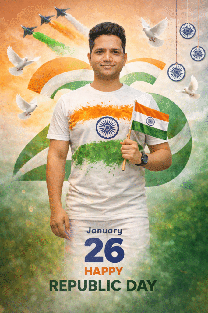 Use the uploaded selfie as the exact facial reference. Firstly, create a highly realistic, artistic Republic Day poster-style image. Person standing confidently at the center in a patriotic pose, holding a small Indian flag. Additionally, wearing a stylish white t-shirt with a tricolor paint splash design (saffron, white with Ashoka Chakra, green), shirt fully visible. Meanwhile, the background features a creative Republic Day design with a large tricolor “26” behind the person, Indian flag gradients, white doves, fighter jets in the sky, and hanging Ashoka Chakra elements. Finally, add text “January 26 Happy Republic Day” in a clean, bold festive font. Vibrant colors, smooth lighting, sharp focus, realistic skin texture cinematic color grading, ultra-HD 4K, professional Instagram-ready poster. No blur no distortion, no artificial face.