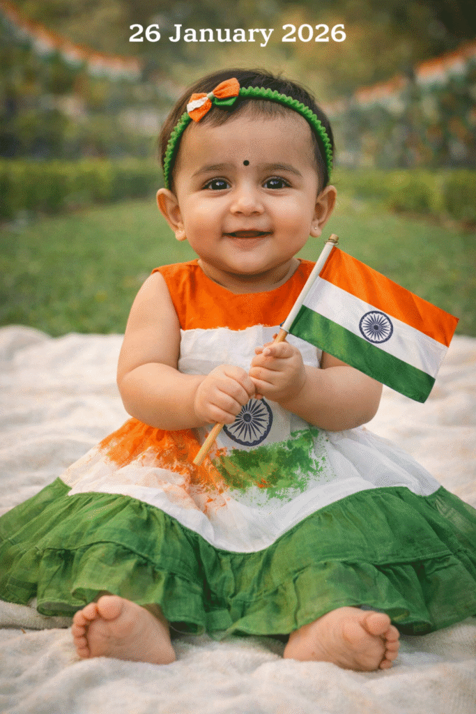 A realistic, high-quality photograph of an Indian baby girl sitting on a soft blanket, wearing a tricolor frock (saffron, white, green), holding a small Indian national flag with Ashoka Chakra, innocent smile, soft natural daylight, blurred background, Republic Day 26 January 2026 celebration mood, DSLR photography, 4K.
