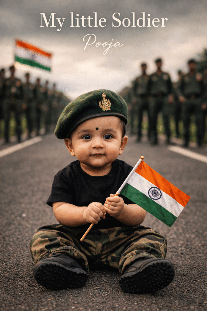 A realistic, cinematic photograph of an Indian baby sitting on an empty road, facing the camera. The baby is wearing a green military beret with an army insignia, a black t-shirt, and camouflage army pants with black shoes. The baby is holding a small Indian national flag (tricolour with Ashoka Chakra) in both hands. The baby has a tiny black bindi on the forehead and an innocent, calm facial expression.In the background, slightly blurred, a group of Indian army soldiers are standing in formation on the same road, wearing dark green military uniforms and berets, with the Indian flag visible behind them. The depth of field is shallow, keeping the baby in sharp focus while the soldiers remain softly blurred.Soft natural daylight, patriotic mood, realistic skin tones, professional DSLR photography, shallow depth of field, bokeh background, ultra-realistic details.Text at the top of the image reads: “My little Soldier” in elegant serif font, and below it the name “Pooja” in a cursive handwritten style.High resolution, portrait orientation, cinematic lighting, national pride theme.