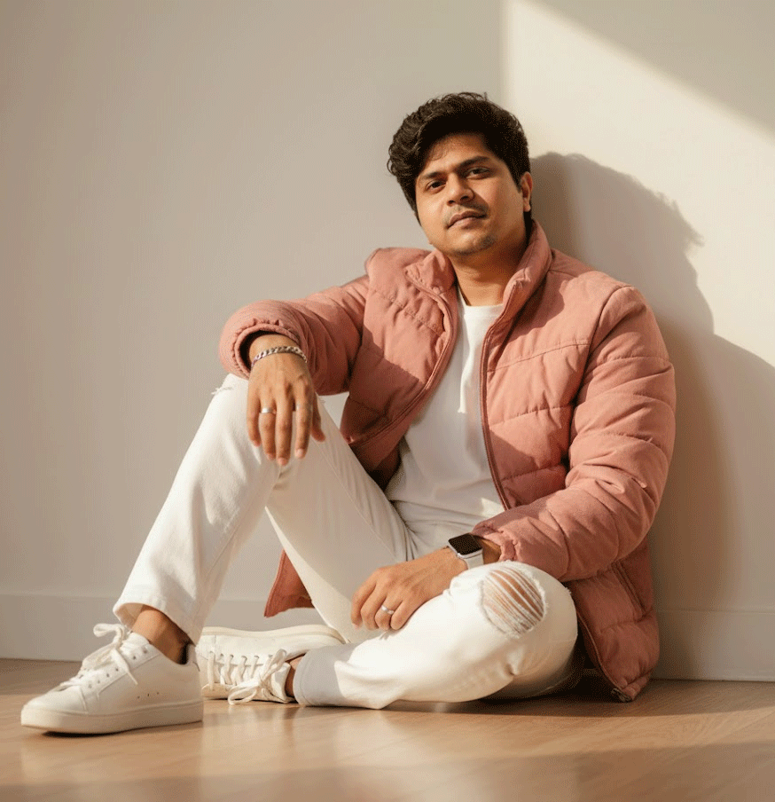 Ultra-realistic full-body portrait of a stylish young man sitting casually on the floor indoors, leaning back against a plain off-white wall with sunlight casting a soft shadow. Outfit: a white round-neck t-shirt layered with a faded pink jeans puffer jacket, paired with distressed white jeans and white sneakers. Accessories include a apple watch, bracelet, and silver rings. His pose is relaxed with one knee bent. upward and his hands, face as uploaded image with dark wavy hair.