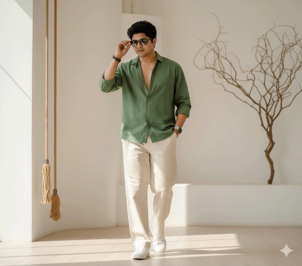 Create image Young stylish Indian man (use refrence image) walking confidently indoors, wearing a relaxed lose green button-up shirt with deep neckline and cream-colored lose pants, white sneakers, modern hairstyle, visible wristwatch and bracelet, hand touching sunglasses near face, soft natural daylight, minimalist white architectural background with curved wall and wooden floor, decorative ropes and bare tree branches cozy neutral color palette.