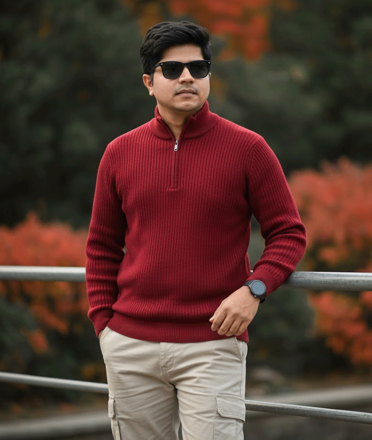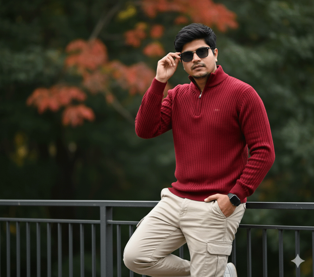 A stylish young man wearing a ribbed, deep red quarter-zip sweater and light-colored cargo pants. He is standing outdoors, leaning against a metal railing, with one hand adjusting his dark sunglasses and the other hand in his pocket, showcasing a round smartwatch. The background features soft, dark greenery and a touch of red-orange foliage. Daylight, high-quality professional photography, shallow depth of field, fashion lookbook style.