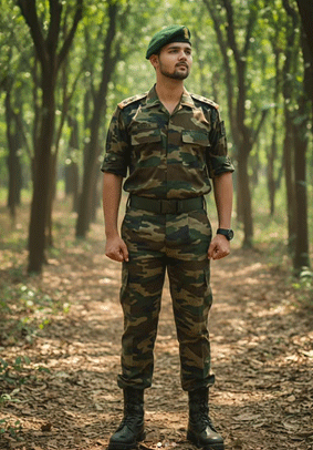 4k ultra HD realistic portrait of a man with your reference face, wearing an Indian Army camouflage uniform and green beret with the national emblem insignia. He stands outdoors in a lush, sunlit forest, with soft green bokeh background and natural lighting, looking confident and proud. The style is sharp, respectful, and cinematic, highlighting honor, duty, and national pride.