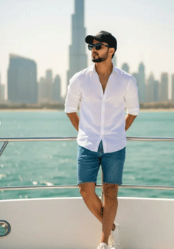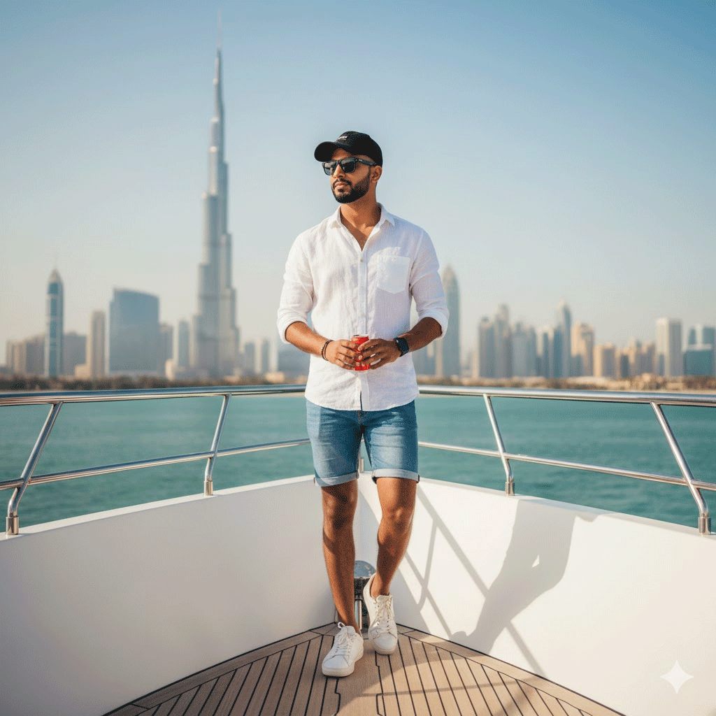 16K ultra-realistic full-body cinematic portrait of an 18-year-old handsome South Asian man with the exact same face, hairstyle, and beard style as in the reference image – do not change or edit his face. He is standing confidently on the deck of a luxurious white yacht under bright daylight with the stunning skyline of Dubai and the Burj Khalifa clearly visible in the background. The calm blue sea reflects the soft sunlight, creating a premium vacation vibe. He is wearing a clean white half-sleeve linen shirt, denim shorts, white sneakers, black sunglasses, and a black cap. He is casually holding a red soda can with both hands while leaning slightly against the yacht’s railing. Lighting is warm, soft, and natural with cinematic color grading, ultra-detailed skin texture, perfect shadows, and crisp highlights. The photo is captured with a shallow depth of field, bokeh background, and rich contrast – givinga luxurious travel aesthetic.