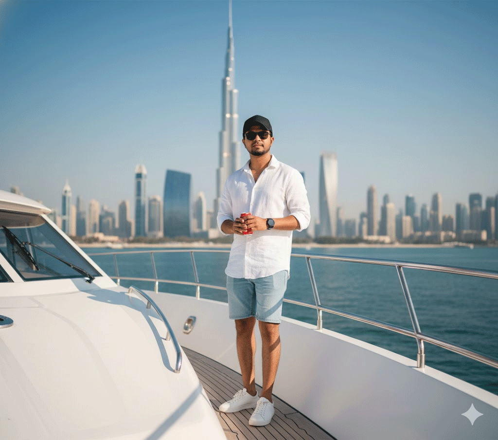 He is standing confidently on the deck of a luxurious white yacht under bright daylight with the stunning skyline of Dubai and the Burj Khalifa clearly visible in the background. The calm blue sea reflects the soft sunlight, creating a premium vacation vibe.