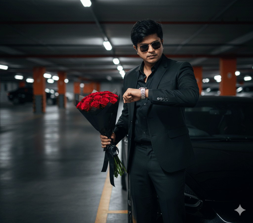 8k Hyper-realistic cinematic 9:16 portrait based on the uploaded image, keeping the same face and messy hair over the eye of A stylish 25 years boy standing in a moderncity parking lot at night, beside a sleek black luxury car. He is wearing a fitted black suit, black shirt, and black trousers, accessorized witha luxury wristwatch and dark In one he holds a bouquet offresh wrapped in elegant black paper with ribbon while checking his with the other hand, 100% Real Face 8K Resolution