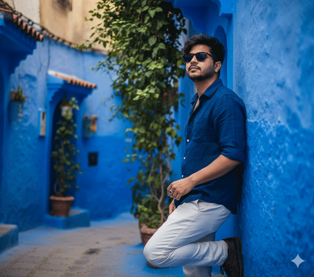 Image Size: half body Face & Body: 100% original, no alterations Body Type: slim but commanding presence Hair: 100% original Height: 5’8″ (173 cm) Location: narrow alley of Chefchaouen, deep blue walls and ivy vines. Camera: Canon R5C, 35mm f/1.4 lens.