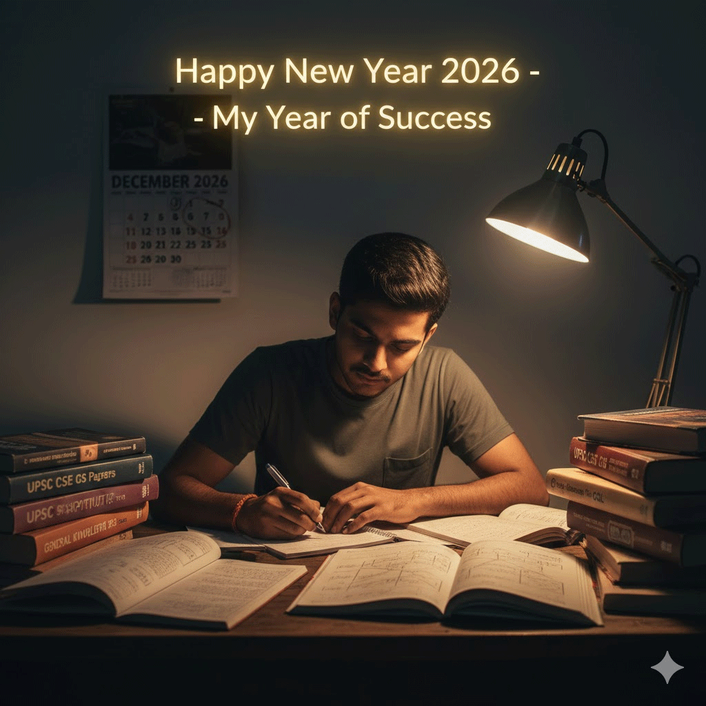 "action_input": "A determined Indian student studying late at night for a government exam (Sarkari Naukri), sitting at a wooden desk with a stack of thick competitive exam books and handwritten notes. In the background, a wall calendar prominently shows '2026'. The room is dimly lit by a warm desk lamp, creating a focused, cinematic atmosphere. High on the wall, glowing text reads 'Happy New Year 2026 - My Year of Success'. Realistic style, high detail, motivational and inspirational mood, sharp focus on the student's face."