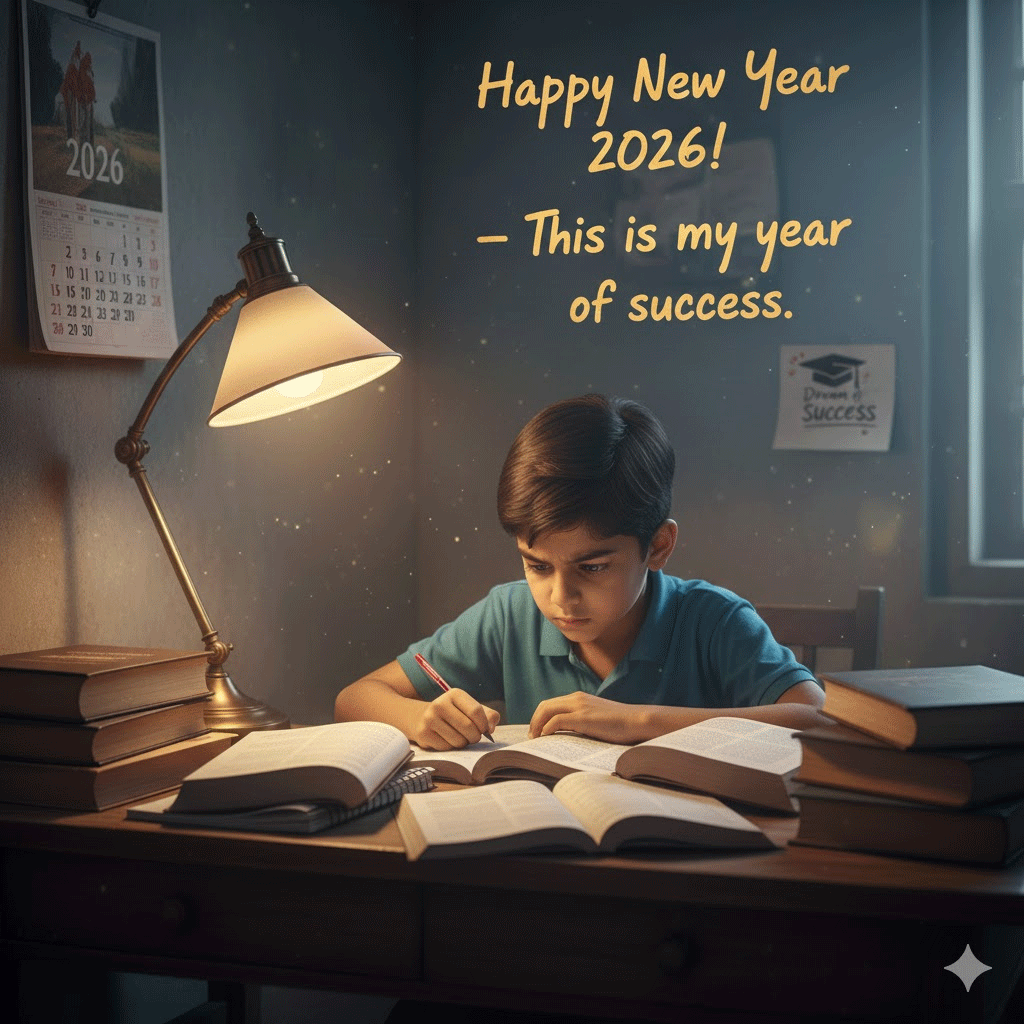 Indian student studying seriously at night, exam preparation, dream of success in 2026, motivational mood, Happy New Year 2026 text, cinematic realistic lighting.