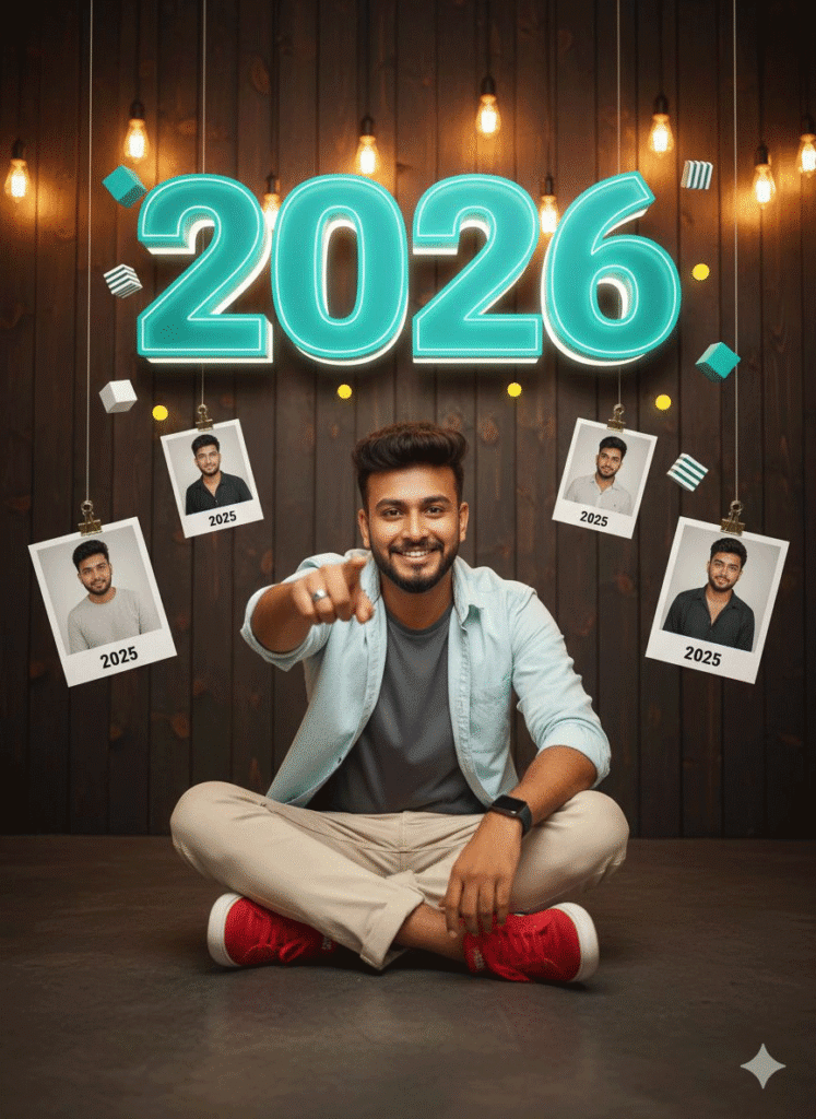 A hyper-realistic, 8k, low-angle wide-shot captures a person seated cross-legged on a dark, flat ground surface, leaning slightly forward and pointing directly at the viewer with their right hand. The subject is wearing a light blue long-sleeved shirt unbuttoned over a dark undershirt, light beige slim-fit pants, and vibrant red lace-up sneakers, with a silver ring on their right hand and a dark smart watch on their left wrist. The uploaded face as reference is smiling, with hair styled . Behind the subject, a large, glossy, volumetric 3D graphic of "2026" in a vibrant teal color with a subtle inner glow and dark shadows is prominently displayed in the upper-center. Several small, abstract 3D cubes (some white with black stripes, some solid teal) and small yellow circular dots float dynamically around the "2026" text. Four polaroid-style photos, each depicting the uploaded face as reference in different poses and clothes and styled from "2025" and labeled "2025" at the bottom, are floating in mid-air around the subject, two on each side, held by small metallic clips. The background features a dark, vertically planked wooden wall, with multiple strings of warm, glowing Edison-style light bulbs hanging in the mid-ground, creating a beautiful bokeh effect. The scene is illuminated with cinematic lighting, featuring a soft, diffused key light on the subject from the front-right, subtle rim lighting on the subject's hair and shoulders from the background lights, and a warm glow emanating from the string lights, all contributing to a highly detailed texture and vibrant atmosphere. mobile ratio.