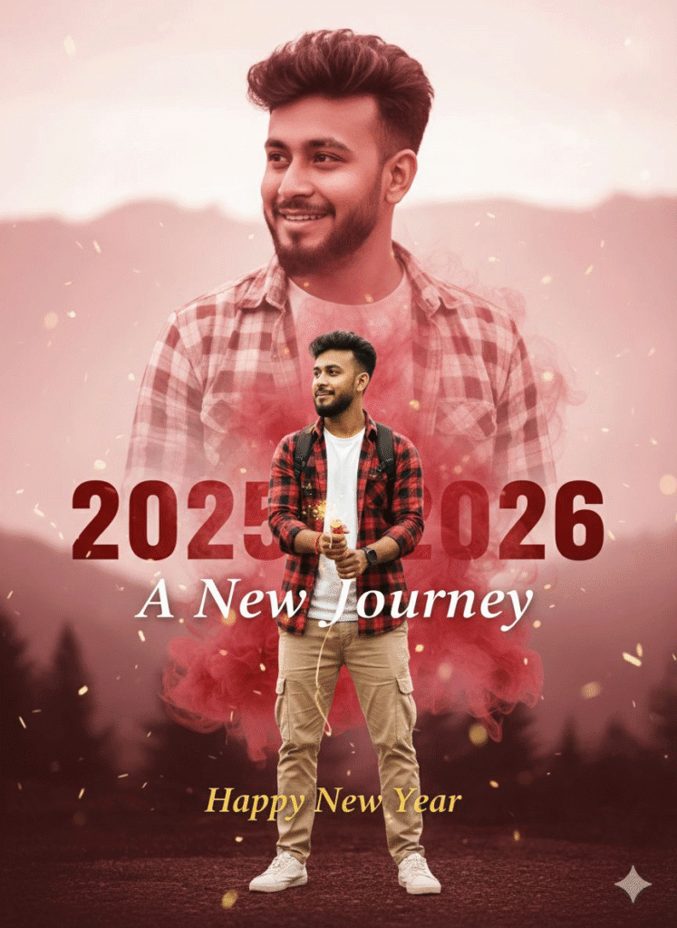 Create a cinematic Happy New Year 2026 double-exposure poster using my uploaded selfie as a face reference, with a blurry light red and bright sky background featuring hazy mountains and trees; add a slightly blurred half-body portrait (without a bag) in the sky, wearing a white t-shirt and a light red checkered shirt, and a clear full-body version in the foreground, showing a white t-shirt, an open red checkered shirt, bright cargo pants, and shoes, holding a party popper in both hands. Include a black bag on the back; both faces should be 100% identical to the uploaded photo and have a slight smile; place the bold text "2025-2026" in red behind the full-body figure and "A New Journey" below it, add "Happy New Year" near the shoes, include cinematic red smo…