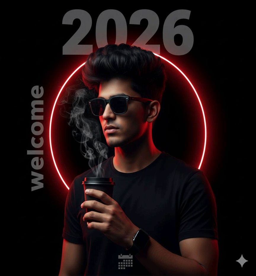 A realistic photo manipulation of a stylish young Indian boy with voluminous hair, wearing black sunglasses and a plain black t-shirt. He is holding a black disposable coffee cup with steam rising from it. He also has a black smartwatch on his wrist. The background is pitch black. Behind his head, there is a glowing red neon ring circle. Large bold grey text '2026' is written at the very top. The word 'welcome' is written vertically on the left side in grey. At the bottom, there is a small calendar grid. High contrast, cinematic lighting, 4k resolution."