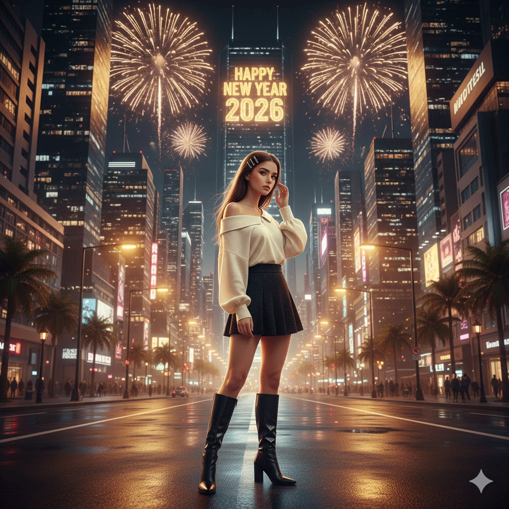 "A stunning New Year celebration scene in a modern futuristic city at night. A beautiful young woman standing confidently in the middle of an empty city road. She has long straight brown hair with cute metallic hair clips on one side, smooth fair skin, big expressive eyes, and a soft natural makeup look. She is posing slightly sideways with one hand touching her hair, giving a calm elegant expression. She is wearing an off-shoulder loose top with rolled sleeves, a short dark high-waist skirt, and long black knee-high boots. Her outfit looks stylish, trendy, and glowing under city lights.