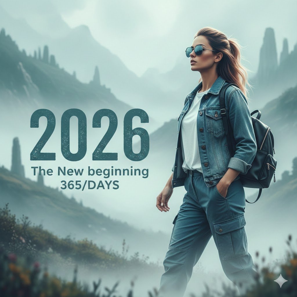 "Create hyper-realistic 8k cinematic portrait of a uploaded woman wearing sunglasses, blue denim and white t-shirt, blue cargo and left hand black backpack walking confidently across a soft, blurred foreground. The background misty ethereal landscape, dominated by muted teal, blue and light gray tones subject large style text overlay reads '2026' bold, slightly distressed teal font. Smaller text below it says '365/DAYS' and 'The New beginning' in top. Cinematic, highly-detailed, soft lighting, style, new year. Camera angle is left side. stylish hair style. keep person face 100% same as shown in reference image. Stylish pose clear face DSLR camera quality. text left side bich mein. hot women. Exact 100% face match"