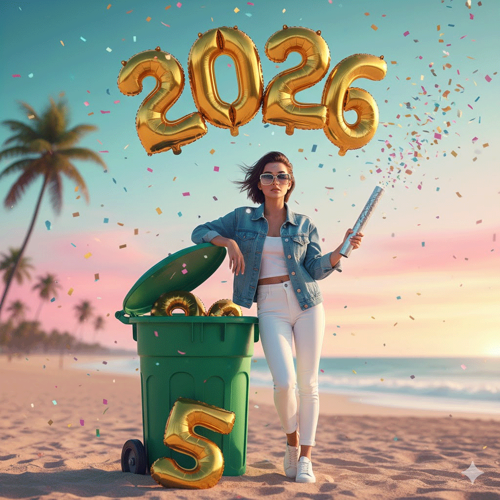 "Ultra-realistic, highly stylized portrait of a young stylish woman standing on a beach at sunset, leaning casually against a green dustbin. Gold foil balloon numbers '2026' floating above his head in the sky. Inside the open dustbin, gold balloon numbers '202' placed as if thrown away, and a single golden balloon number '5' lying near the bottom edge. Colorful confetti falling in the air, festive celebration vibe. The woman is wearing fashionable sunglasses, modern hairstyle, light blue and white outfit, slim-fit pants, and sneakers. She holds a silver confetti cannon in one hand. Soft glowing light, teal and pink sky gradient, shallow depth of field, smooth shadows, cinematic editing, highly detailed 8K ultra-realistic photo, Instagram-style digital art look. the young woman's face matches the uploaded reference image. Exact 100% face match."