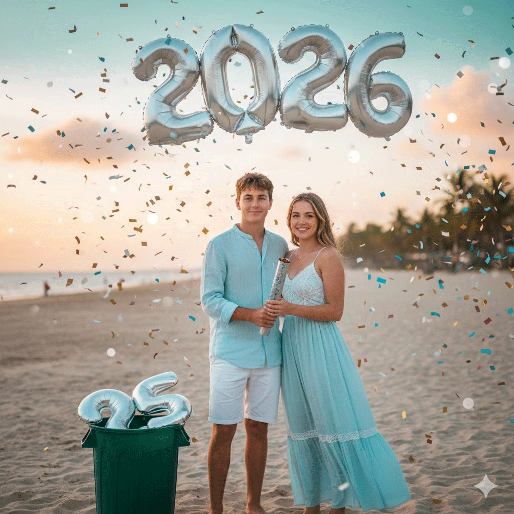 Ultra-realistic 8K couple portrait on a beach at sunset. Boy and girl standing together facing the camera with soft smiles, both wearing coordinated light blue and white outfits. White foil balloon ‘2026’ floating above them, and inside a green dustbin the white balloon numbers ‘202’ and a single ‘5’ lying near the bottom as thrown away. Colorful confetti falling in the air, festive New Year vibe. Boy holding a silver confetti cannon. Soft glowing light, teal-pink sky gradient, cinematic bokeh. Use SAME face match as reference images.
