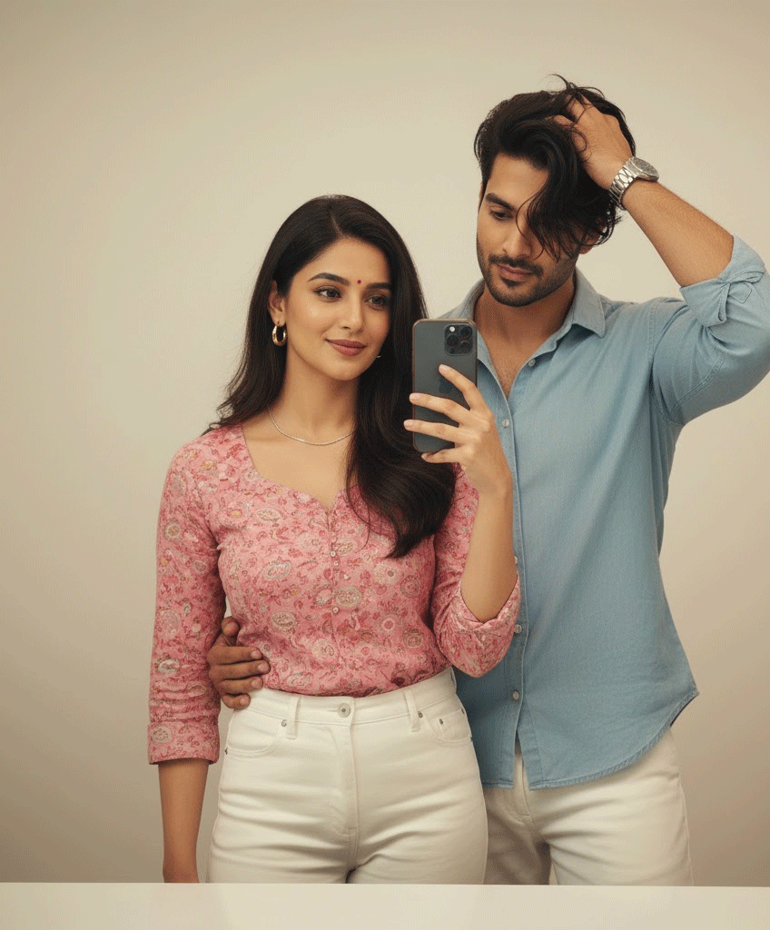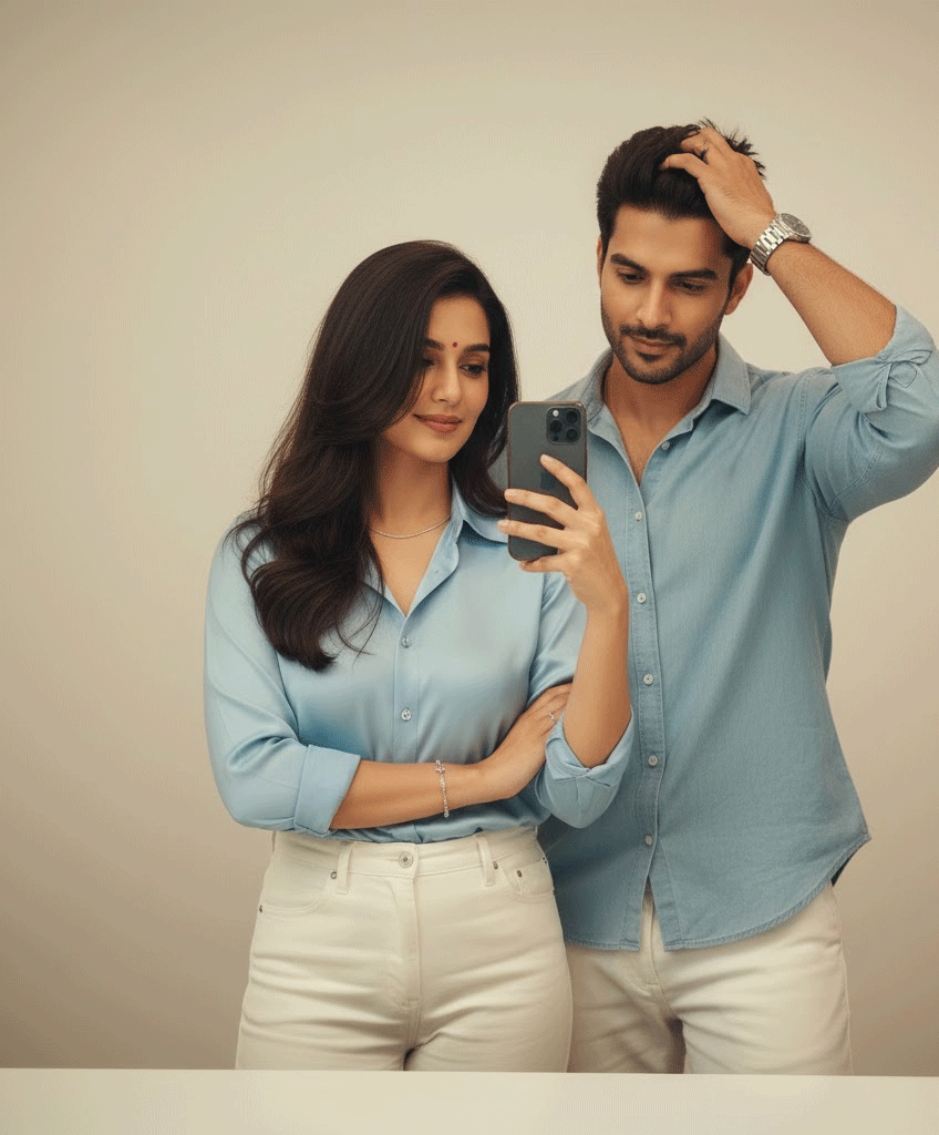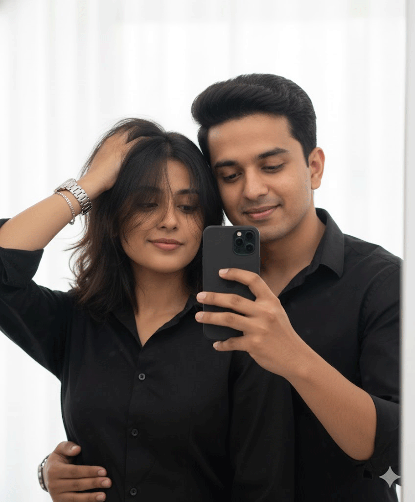 Ultra -realistic a selfie young couples in front of a plain or softly-lit background. Hold your phone in one hand so it's visible in the mirror, and use your other hand to run through your hair, showing your wristwatch or bracelet clearly. Wear a same dress, and make sure your face is partially covered by your hand and hair for a casually stylish look. (Add any 100% same face match in reference)