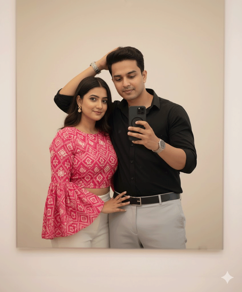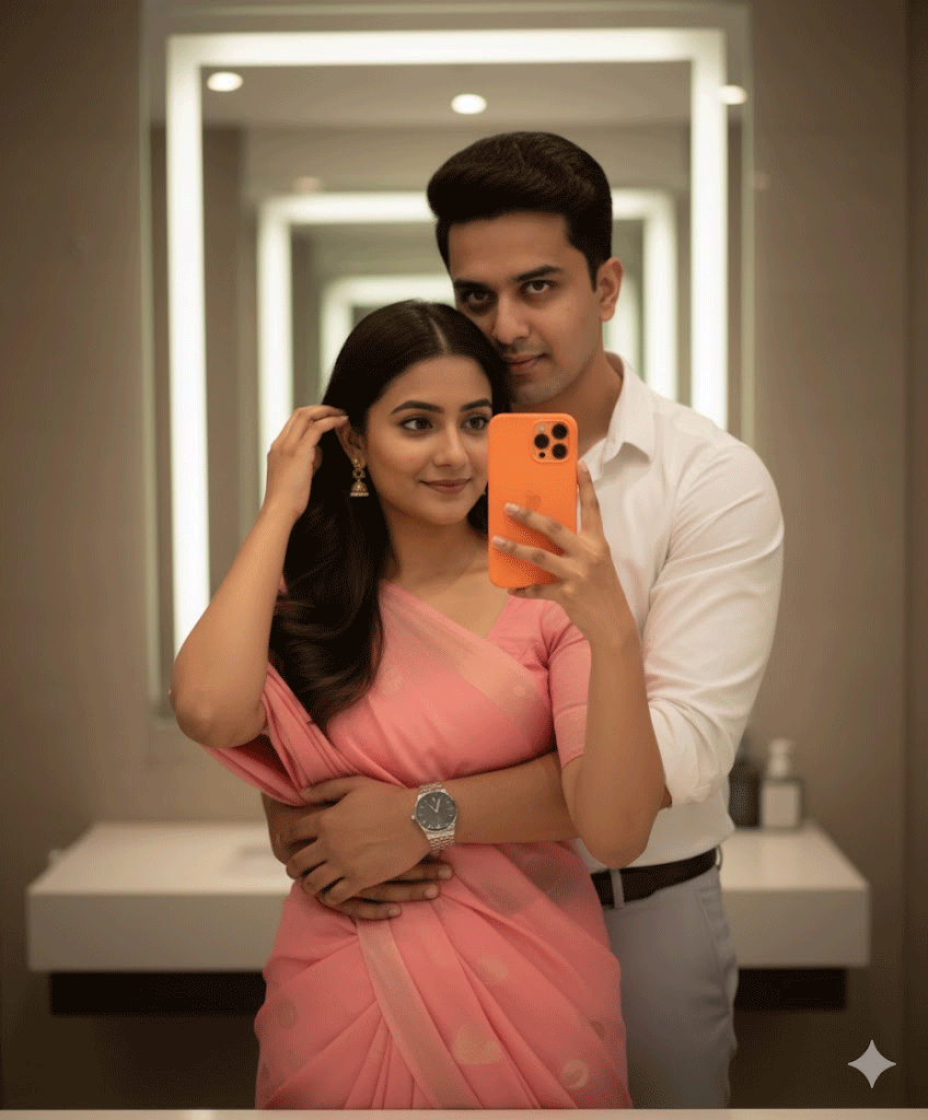 Ultra 16K-Realistic Use a reference photo, which has a 100% match to a boy's face and he is hugging his lover from behind. The girl is slightly shorter than him, her head is resting gently on his chest and is wearing a pink sari. She has one hand on her hair, and with the other hand, she is holding an orange iPhone 17 Pro Max in front of the mirror. The boy's face is half visible in the mirror's reflection, looking at the camera with a confident and seductive look.