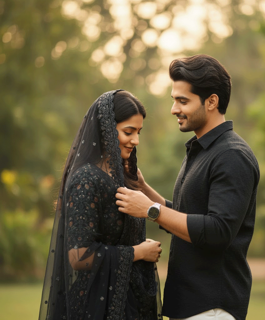 Create a romantic outdoor portrait of a young couple. The man is on the right, gently adjusting the veil of the woman on the left, who is looking down shyly. Both are smiling subtly. The woman is wearing traditional South Asian attire with a dark, embroidered top and a matching dark veil Girls boys camera taraf looking The man is wearing a dark, textured collared shirt and a smartwatch. The background is a soft blur of green foliage, suggesting a garden or natural setting "same face.