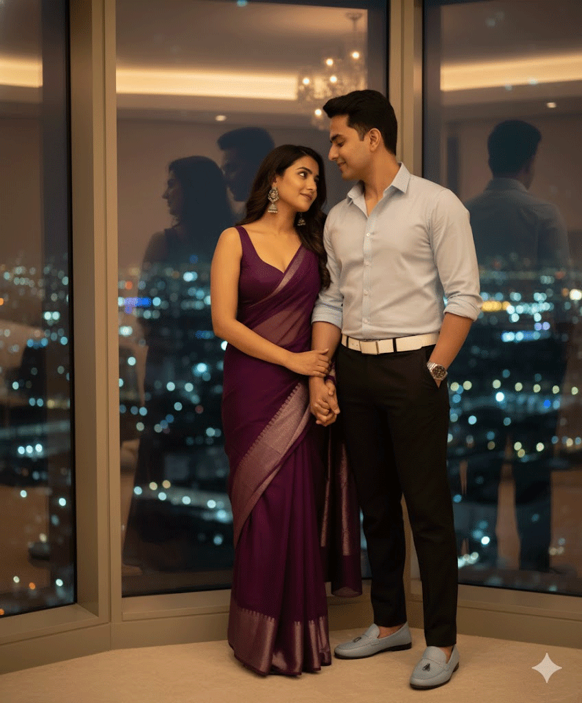 Ultra-realistic 8K cinematic romantic portrait of a stylish Indian couple standing near a large glass window inside a 7-star luxury hotel suite, overlooking a breathtaking city skyline glowing with golden and blue night lights.