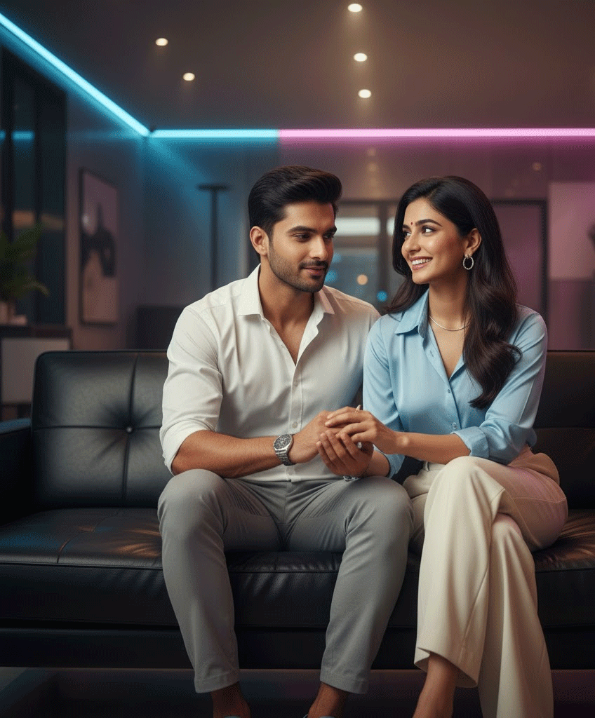 Ultra-realistic 8K cinematic full-body portrait of a 24-year-old handsome Bangladeshi man and his beautiful girlfriend sitting together on a sleek black leather sofa in a stylish, modern lounge. The man leans slightly forward with both elbows resting on his knees, holding his girlfriend's hand gently. His face and hairstyle exactly match the uploaded reference image, with his hairstyle perfectly set, and his face looking directly at the camera confident, well-groomed, and expressive, with a soft smile. He wears a white button-up shirt with sleeves rolled halfway up and light grey tailored chinos, with minimal accessories, giving a polished yet relaxed look. His girlfriend gazes at him with a joyful, glowing expression. She wears a fashionable pastel outfit with minimal jewelry, her silky hair cascading naturally over her shoulders. The ambience features soft neon reflections and warm cinematic lighting, enhancing their chemistry and the modern décor around them. Ultra-realistic texture