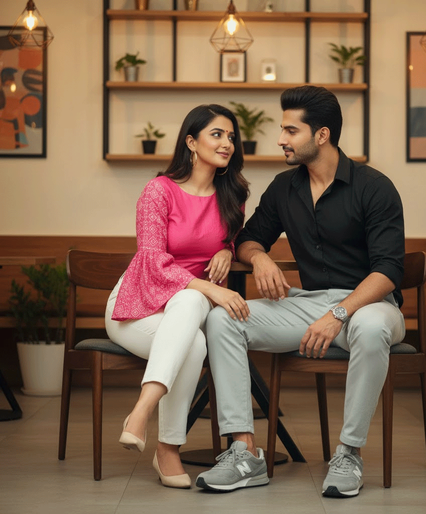 Git: 1000 oniginal face & hair, natural waves, expressive eyes with kala surma, pink lips. Vibrant pink blouse with white geometric/floral patterms, wide flowy bel sleeves, soft cotton/silk blend, fitted torso, round/boat neckine.Gold hoop earrings, white nails. Sitting next to boy or angled toward him, playful gentle smile, relaxed candid pose.Environment & lighting: Stylish indoor cafe, bright warm decorativelighting, cozy cinematic vibe, photorealistic textures. Camera & Quality: Hasselblad X2D 11100C, ultra realistic 4K, cinematic, photorealistic.