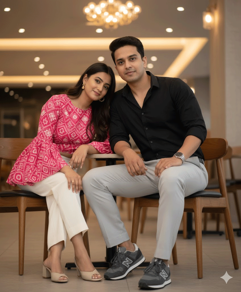 Hyperrealistic fullbody portrait of stylish Indian couple in a chicindoor cafe.