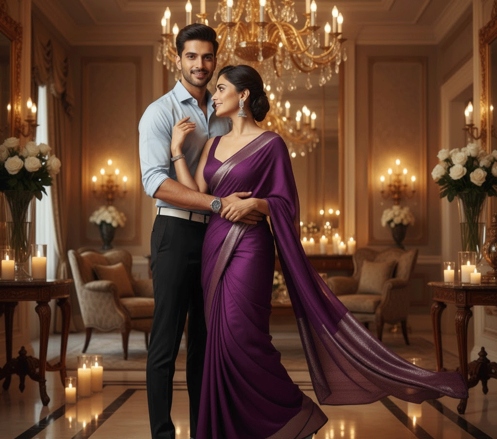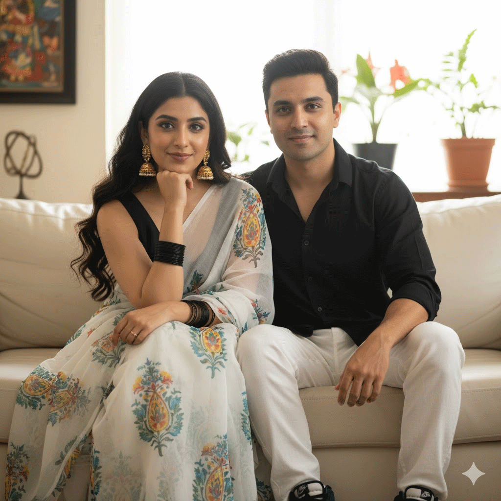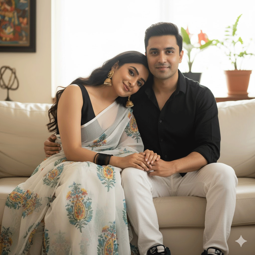 Generate a portrait of a young Indian Couple comfortably, looking directlyat the viewer with a gentle smile. She is wearing an elegant -white transparent saree with, colorful design paired with a black sleeveless blouse and A Man wearing Black shirt and white sleeveless pant and black and white air jordan sneakers. Her hair is styled in soft waves, and she is adorned with large intricate earrings and multiple black bangles on both wrists. She is resting her chin on her hand.