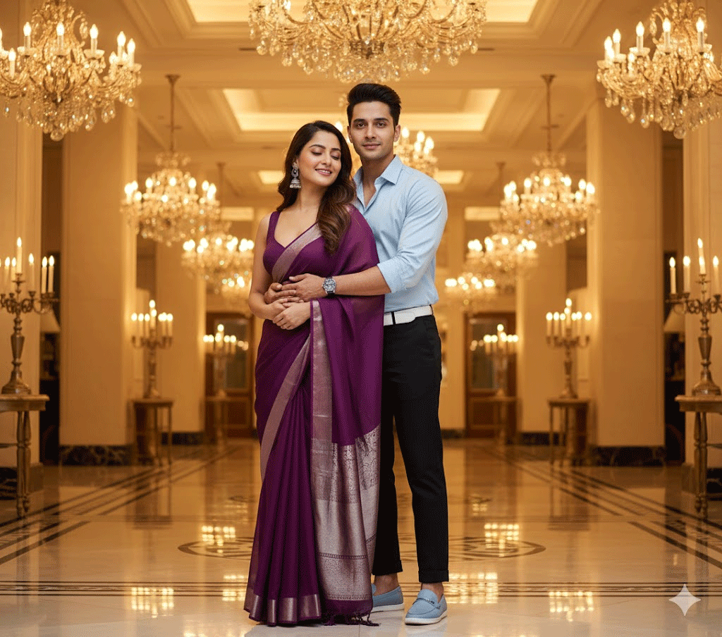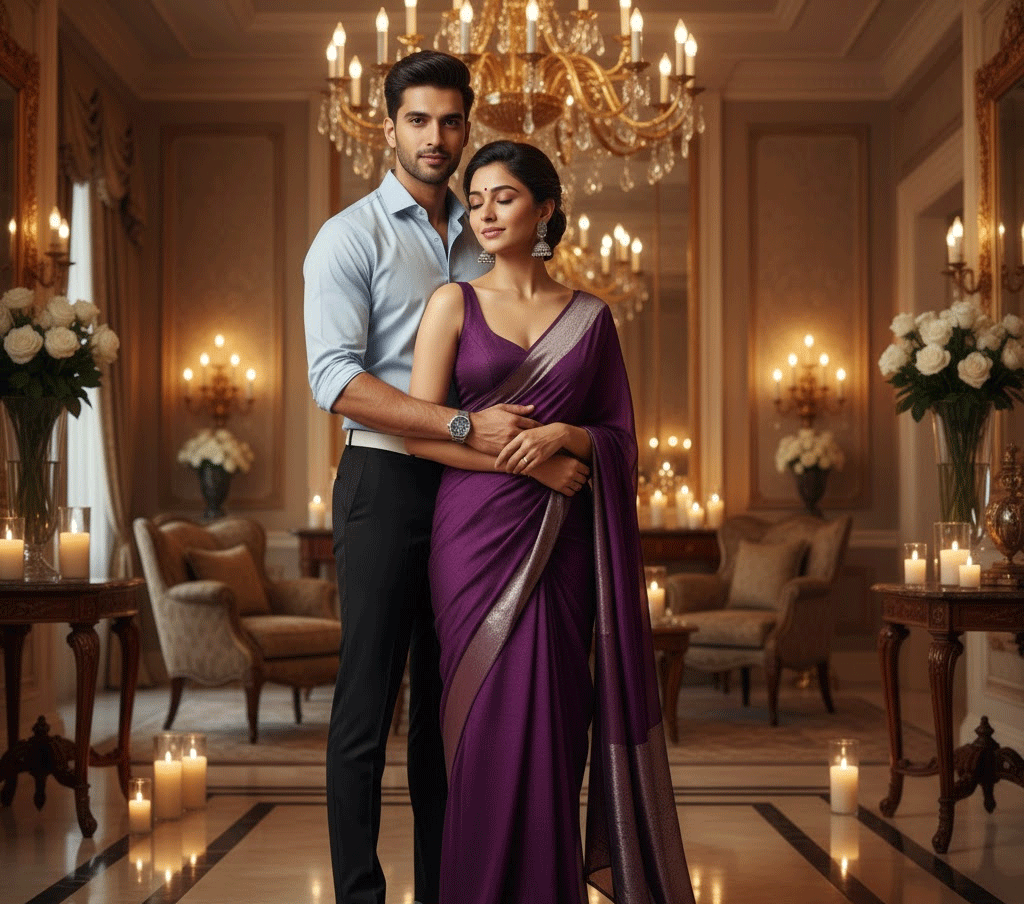 Ultra-realistic 8K cinematic romantic portrait of a stylish Indian couple inside a 7-star luxury hotel, glowing with golden chandeliers, marble flooring, soft candlelight, and elegant decor.