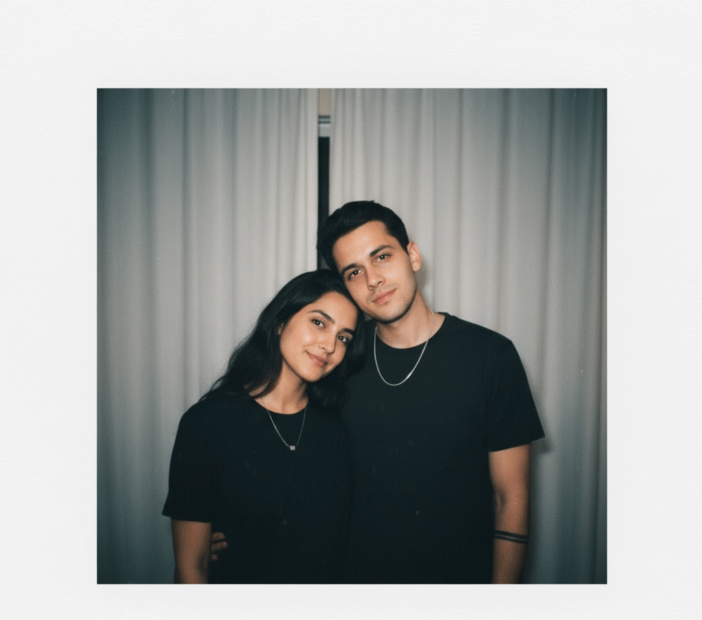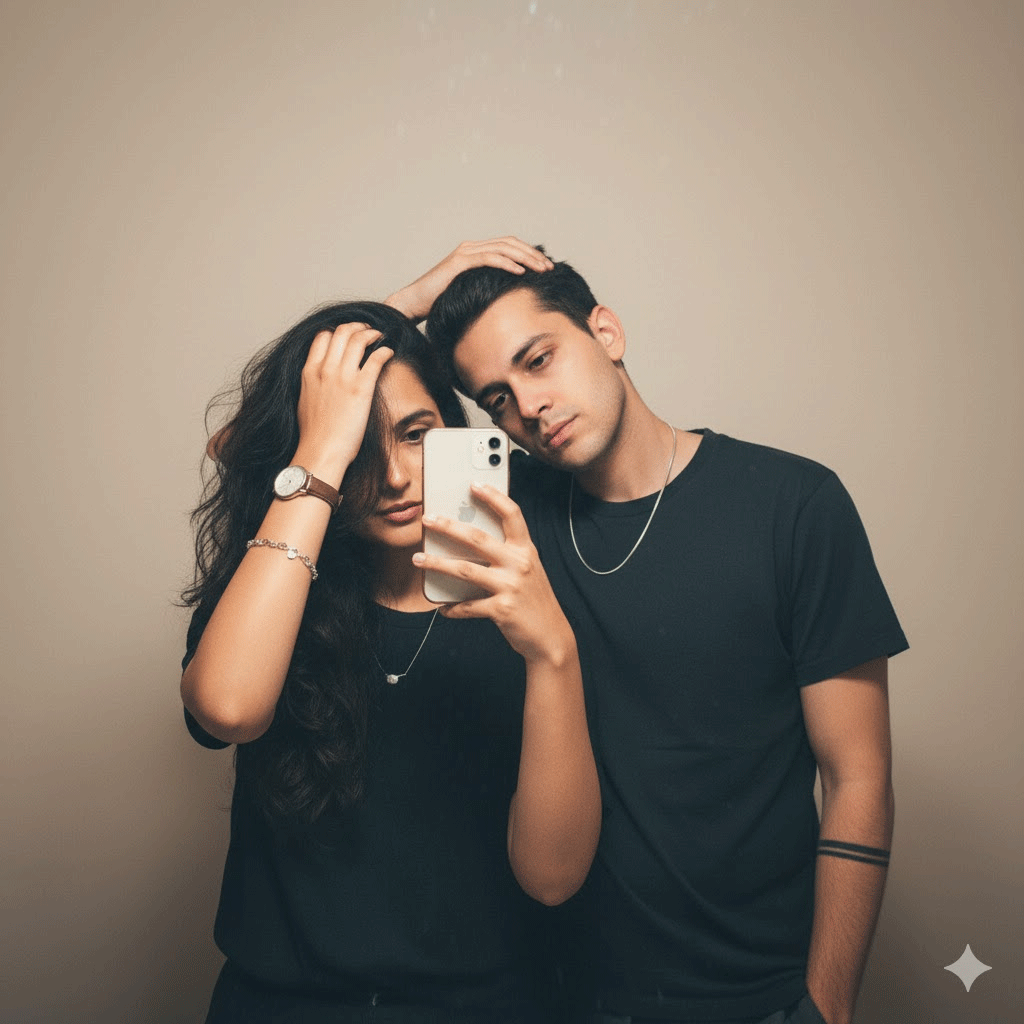 Ultra -realistic Take a selfie young couples in front of a plain or softly-lit background. Hold your phone in one hand so it's visible in the mirror, and use your other hand to run through your hair, showing your wristwatch or bracelet clearly. Wear a dark top and a chain necklace, and make sure your face is partially covered by your hand and hair for a casually stylish look. Add any visible arm tattoos or minimal accessories to match the vibe." 100% same face match in reference.