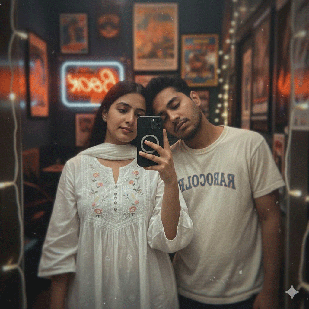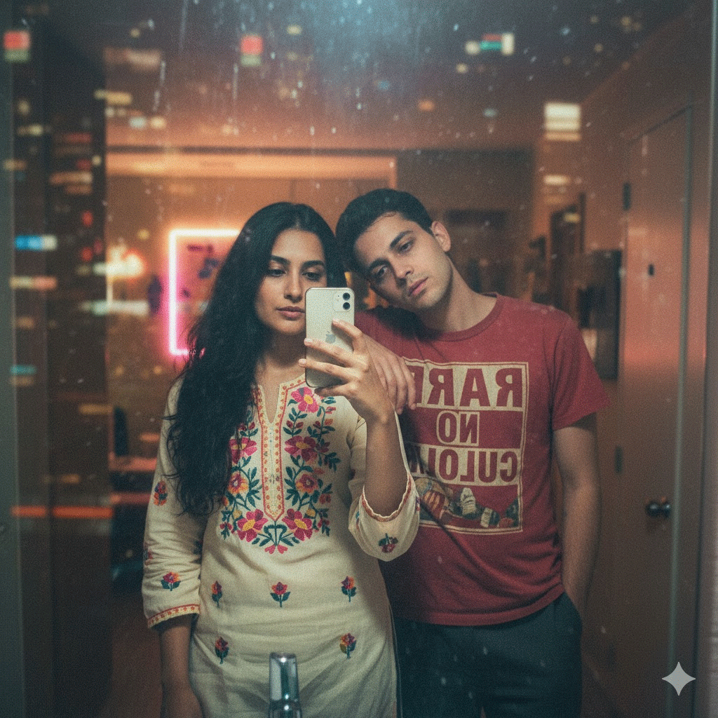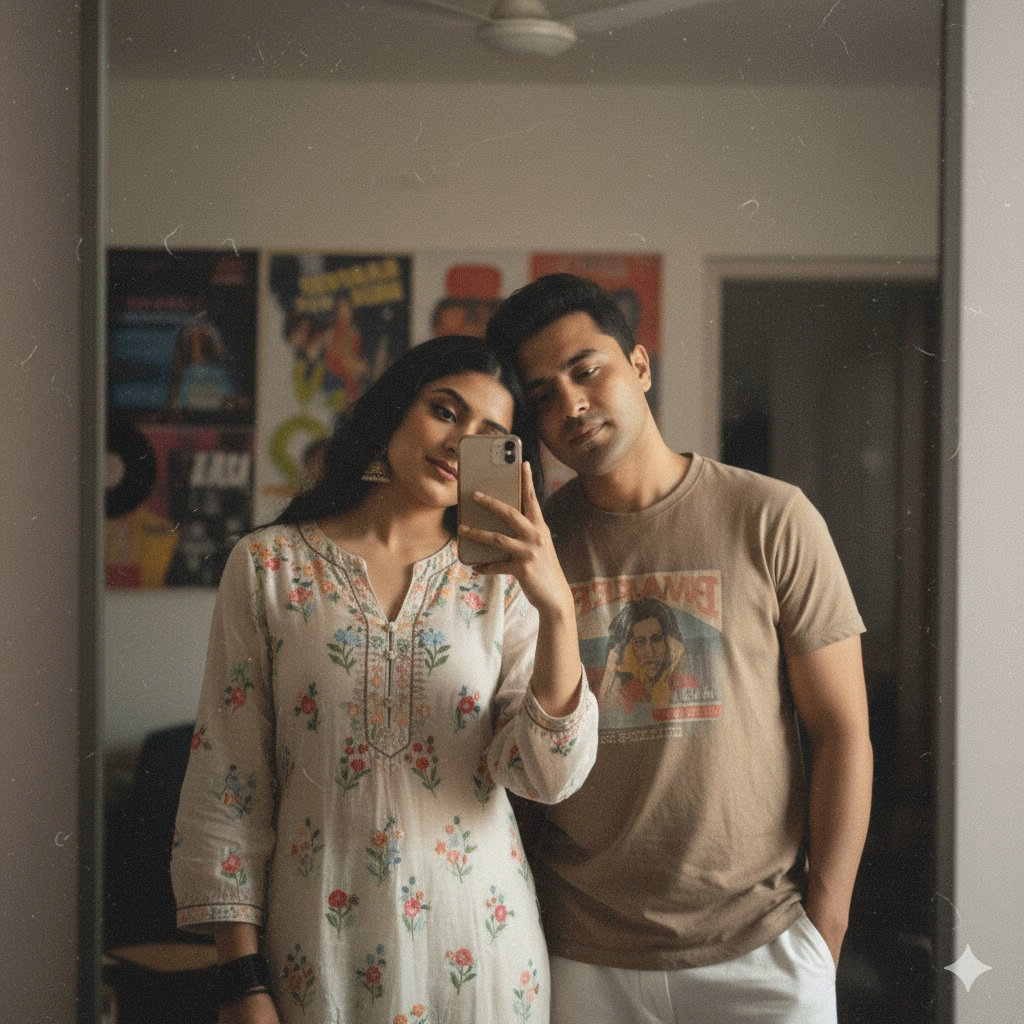 Create A iPhone mirror selfie of Woman in picute uploaded with a lo-fi background, with the men in picture uploaded, wearing a vintage, rar On colour t-shirt, and women wearing kurta with floral embroidery, leaning on a woman shoulder his expression blank with no Dar subject or particular composition-just an unintentional candid shot Slightly blurry Flash photography Grainy texture Edited and soft focus Capturing an imperfect moment. Same this photo ka cloth.