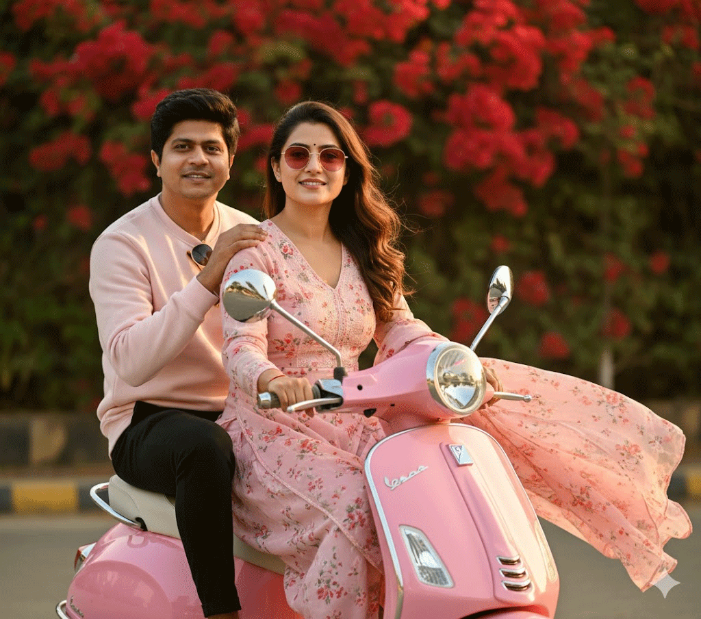A hyper-realistic cinematic outdoor photograph of a couple taking a selfie beside a shiny pink Vespa scooter with a white seat, parked on a sunlit road surrounded by red bougainvillea flowers in full bloom.