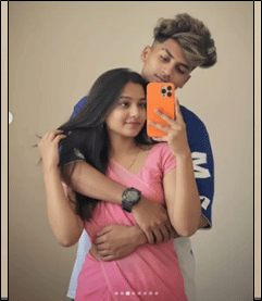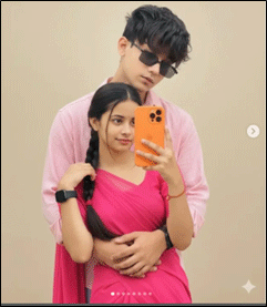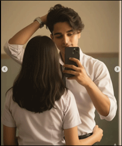 Use a reference photo, which has a 100% match to a boy's face and he is hugging his lover from behind. The girl is slightly shorter than him, her head is resting gently on his chest and is wearing a pink sari. She has one hand on her hair, and with the other hand, she is holding an orange iPhone 17 Pro Max in front of the mirror. The boy's face is half visible in the mirror's reflection, looking at the camera with a confident and seductive look.