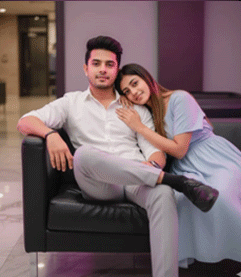 Ultra-realistic 8K cinematic full-body portrait of a 24-year-old handsome Bangladeshi man and his beautiful girlfriend sitting together on a sleek black leather sofa in a stylish, modern lounge. The man leans slightly forward with both elbows resting on his knees, holding his girlfriend's hand gently. His face and hairstyle exactly match the uploaded reference image, with his hairstyle perfectly set, and his face looking directly at the camera confident, well-groomed, and expressive, with a soft smile. He wears a white button-up shirt with sleeves rolled halfway up and light grey tailored chinos, with minimal accessories, giving a polished yet relaxed look. His girlfriend gazes at him with a joyful, glowing expression. She wears a fashionable pastel outfit with minimal jewelry, her silky hair cascading naturally over her shoulders. The ambience features soft neon reflections and warm cinematic lighting, enhancing their chemistry and the modern décor around them. Ultra-realistic texture.