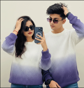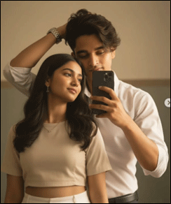 Ultra -realistic a selfie young couples in front of a plain or softly-lit background. Hold your phone in one hand so it's visible in the mirror, and use your other hand to run through your hair, showing your wristwatch or bracelet clearly. Wear a same dress, and make sure your face is partially covered by your hand and hair for a casually stylish look. (Add any 100% same face match in reference)