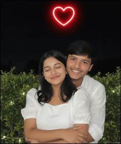 Create image of A cute 20 year old Indian young couple taking a night-time selfie outdoors. The boy is wearing a white and white check shirt and smiling while hugging the girl from behind. The girl is in a white puff-sleeve dress, eyes closed, smiling happily. They are standing near green plants with small lights, and a red heart emoji in glow is above them in the dark background. Bright and candid romantic moment, natural lighting with a flash.