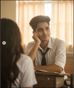 A cinematic, close-up shot, softly lit classroom scene featuring a slim-fit handsome young man gazing thoughtfully at a girl sitting beside him. The boy is wearing a white school shirt with the sleeves rolled up and a black tie slightly loosened. His head rests gently on his hand, with a calm, affectionate, and slightly dreamy expression on his face. The girl, slightly out of focus in the foreground, has long dark hair and is also dressed in a white school uniform. The atmosphere is warm and nostalgic, with sunlight filtering through a window and brown curtains in the background, casting a golden glow. The setting appears like an old classroom with wooden desks, evoking a romantic, youthful, and tender moment.